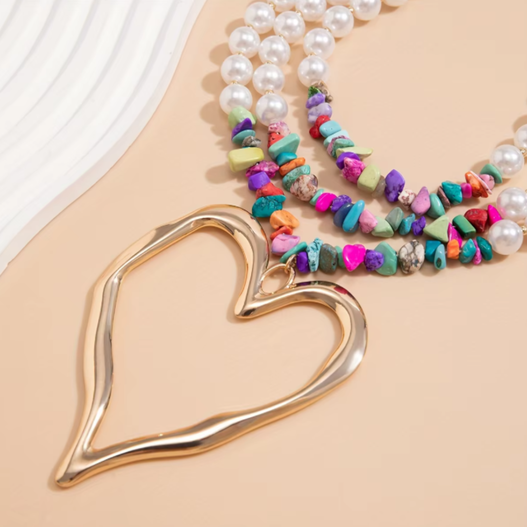 The Ava features beautiful pearls dancing with colorful gemstone chips across gorgeous layers that create amazing depth and style. The bold gold heart pendant becomes your signature style - romantic, confident, and totally unforgettable. Invest in a piece that makes you feel as beautiful as you look.