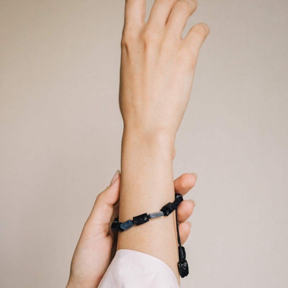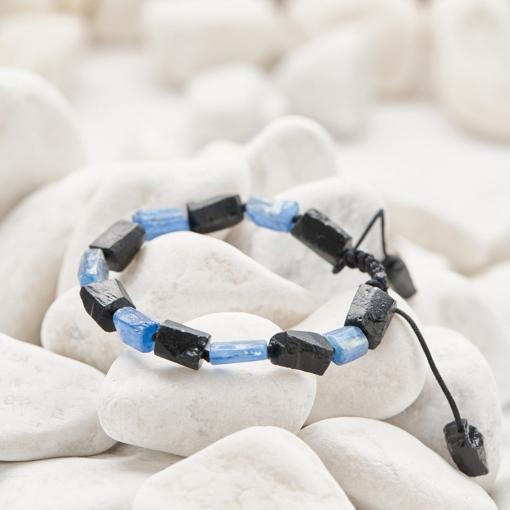 Think of a two-way street where cars pass each other in two different directions. And just like that, two different energies pass each other on our Blue Kyanite and Black Tourmaline Stone Bracelet.
