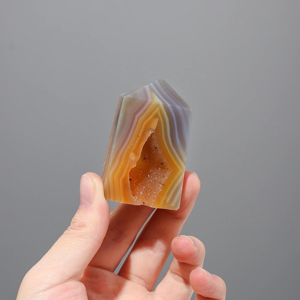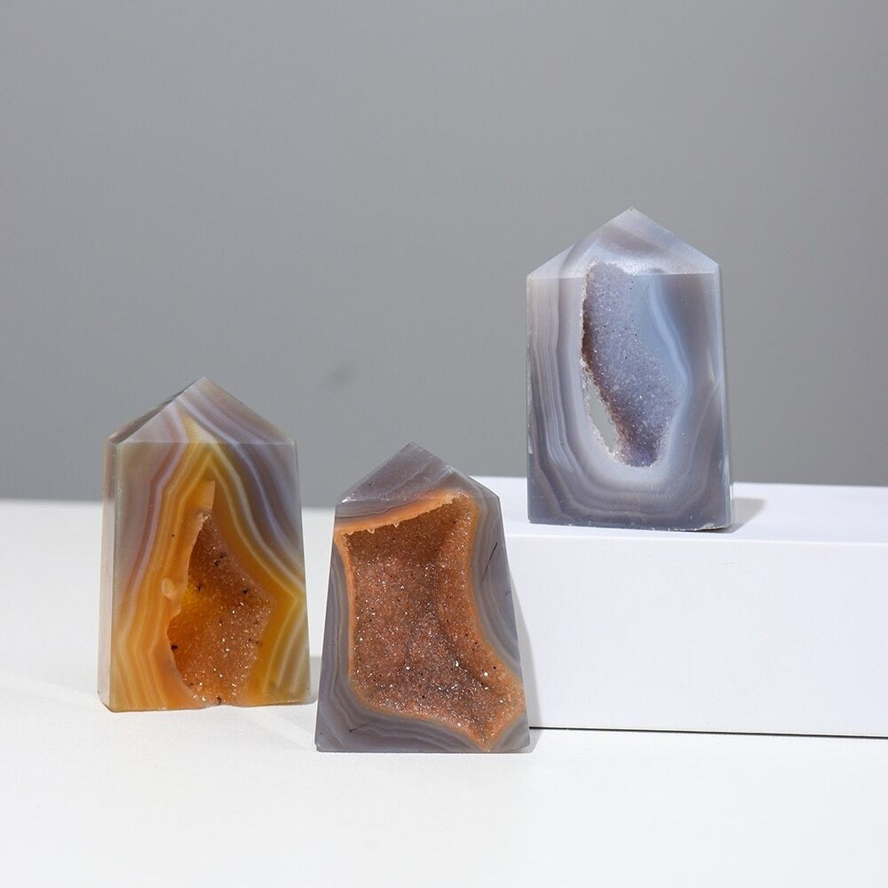 The most distinctive feature of this agate crystal point tower is a unique cave formation in the middle, representing deeper layers of spirituality and mindfulness.