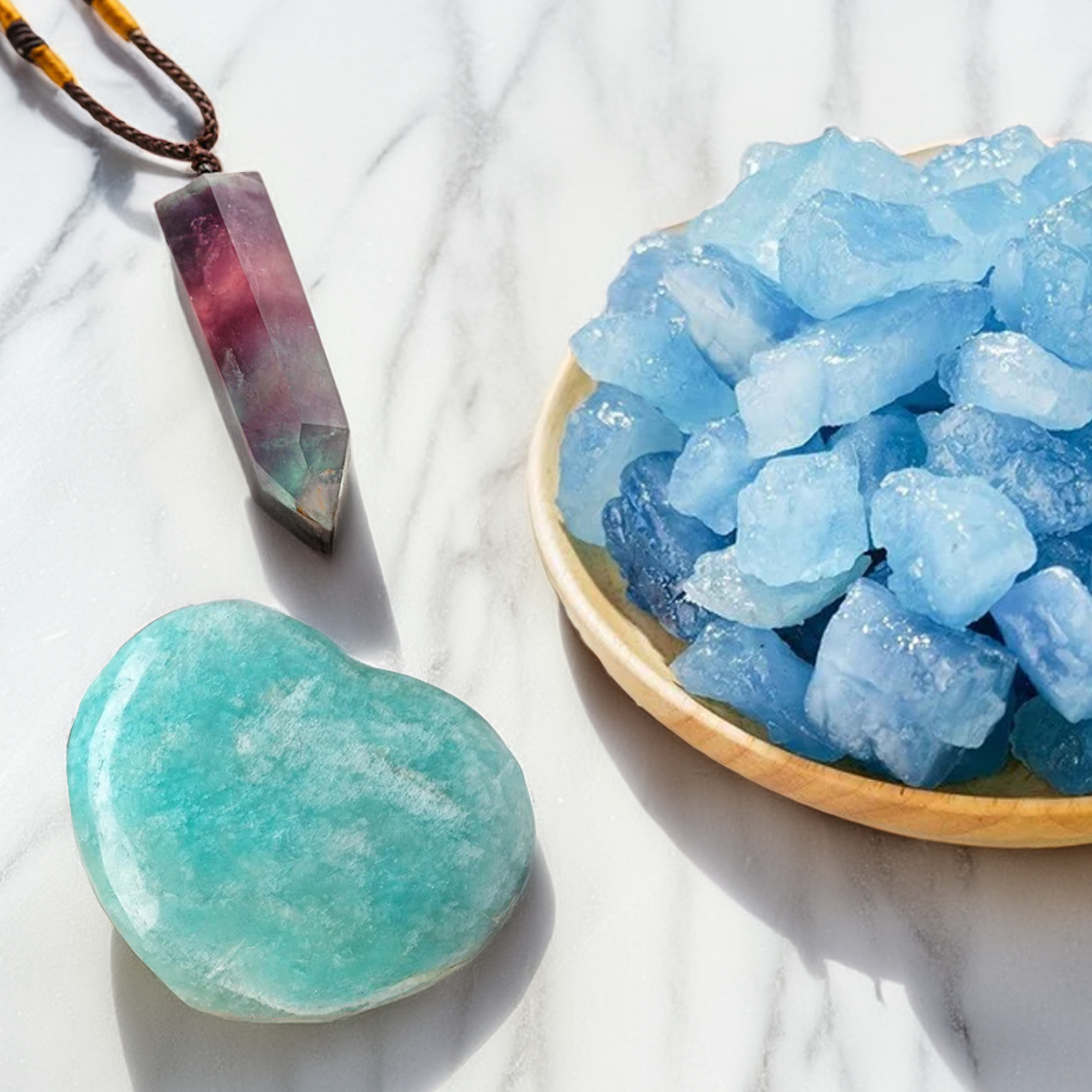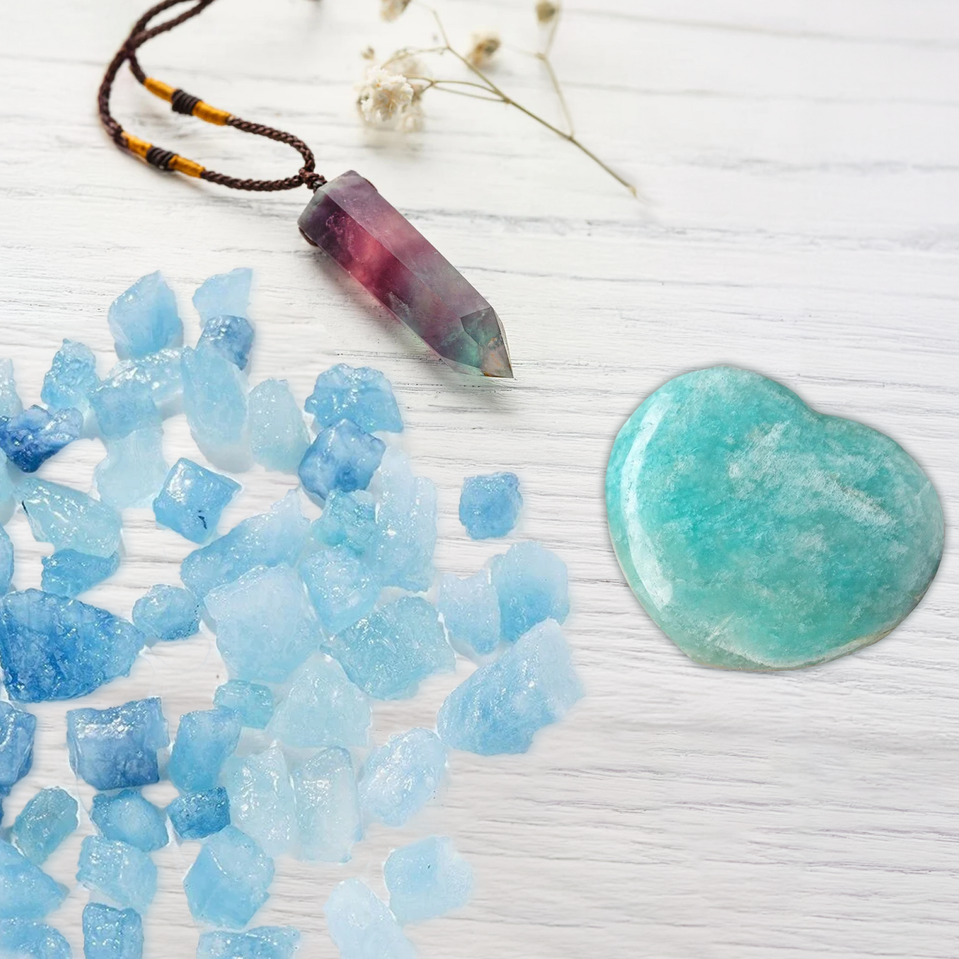 Product Information: This bundle includes Heart Amazonite Stone, Raw Aquamarine Stones, and Fluorite Pendant.