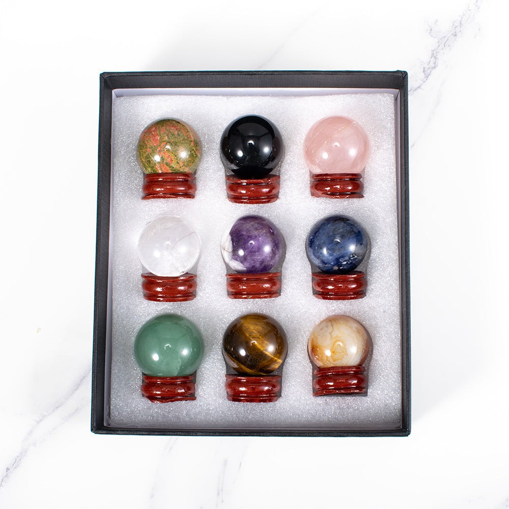 Introducing our enchanting Crystal Sphere Set, a harmonious collection of nine exquisite gemstones meticulously curated to bring positivity, balance, and timeless beauty into your life.