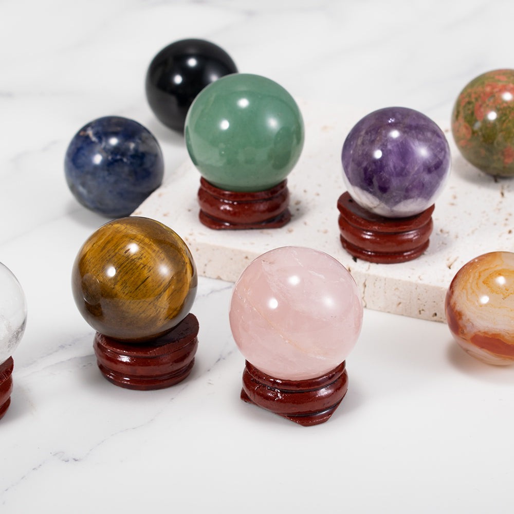 Each crystal ball in this set is a radiant embodiment of nature's finest creations, chosen for its unique energy and aesthetic allure. MS-QUARTZ MS-AGATE MS-AVENTURINE MS-OBSIDIAN MS-ROSE-QUARTZ MS-SODALITE