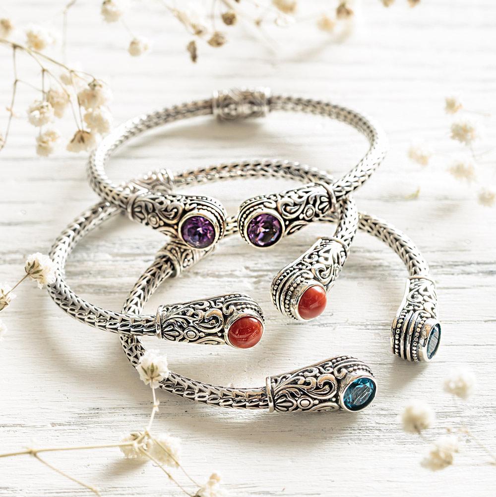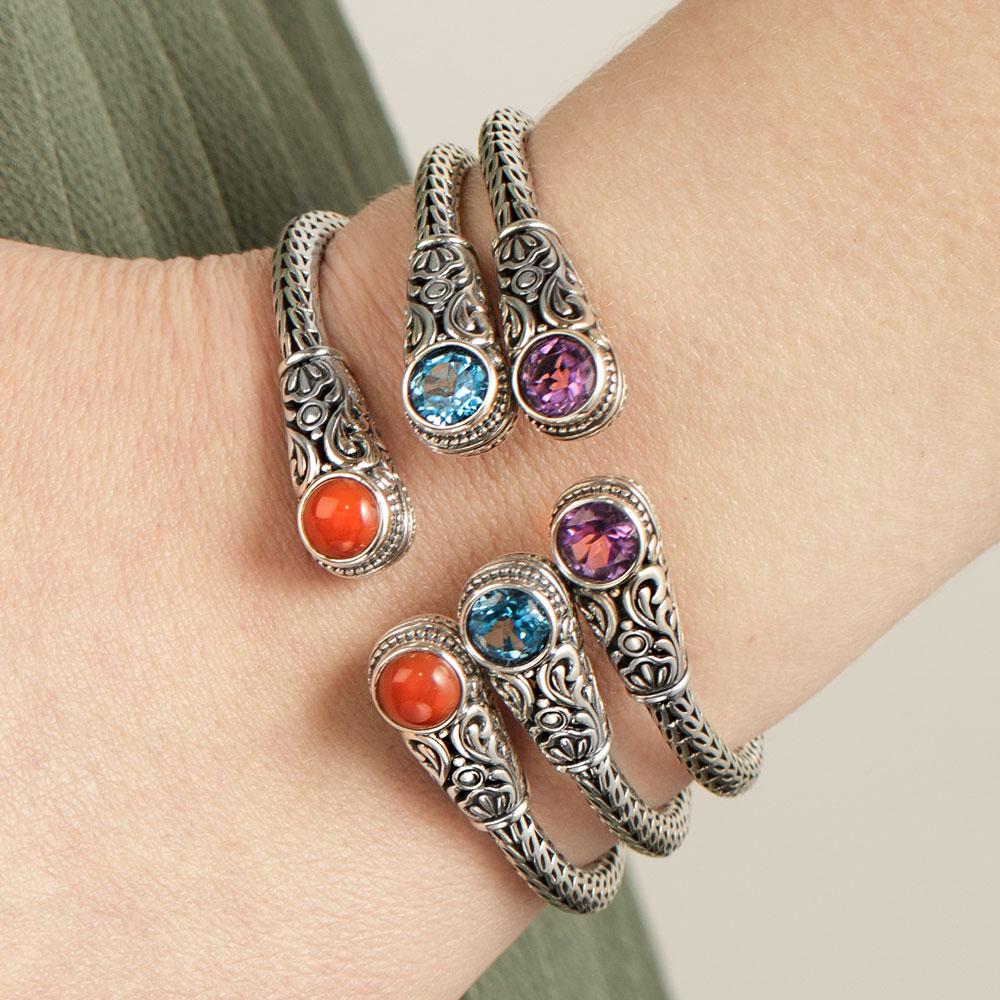 Accented with eye-catching natural jewels (blue topaz, red onyx, or purple crystals) and embellished with individually hand-crafted, exquisite filigree, this piece perfectly blends two worlds: the treasures of the earth and the talents of the men.