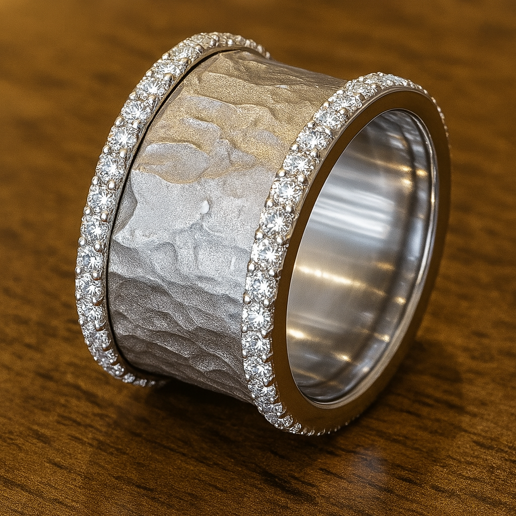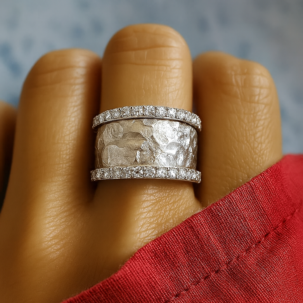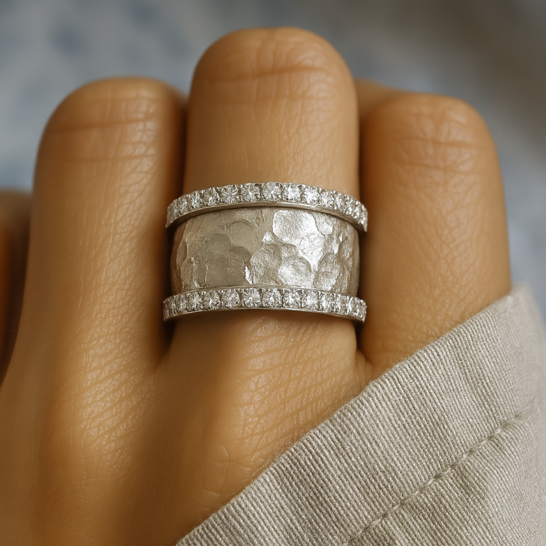 Every ring is lovingly handcrafted in small, exclusive batches with a signature hammered finish that glows from every angle. Two rows of carefully hand-set CZ stones form brilliant borders, creating the perfect frame for this textured masterpiece. Some pieces are meant to be worn and treasured for a lifetime – this is one of them.