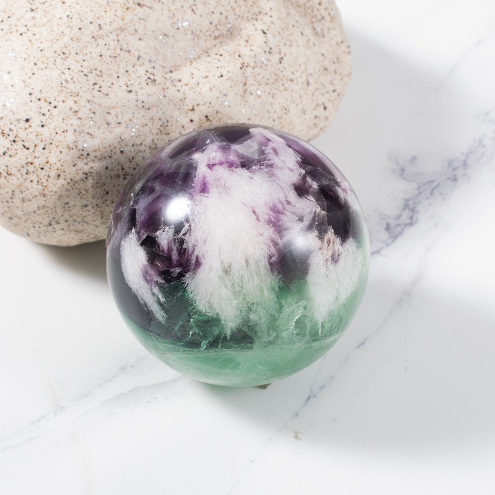 Embrace Nature’s blissful protection with the beautiful Natural Feather Fluorite Crystal Sphere â€?and let its stunning array of colors inspire you to be positive, no matter what life throws at you!