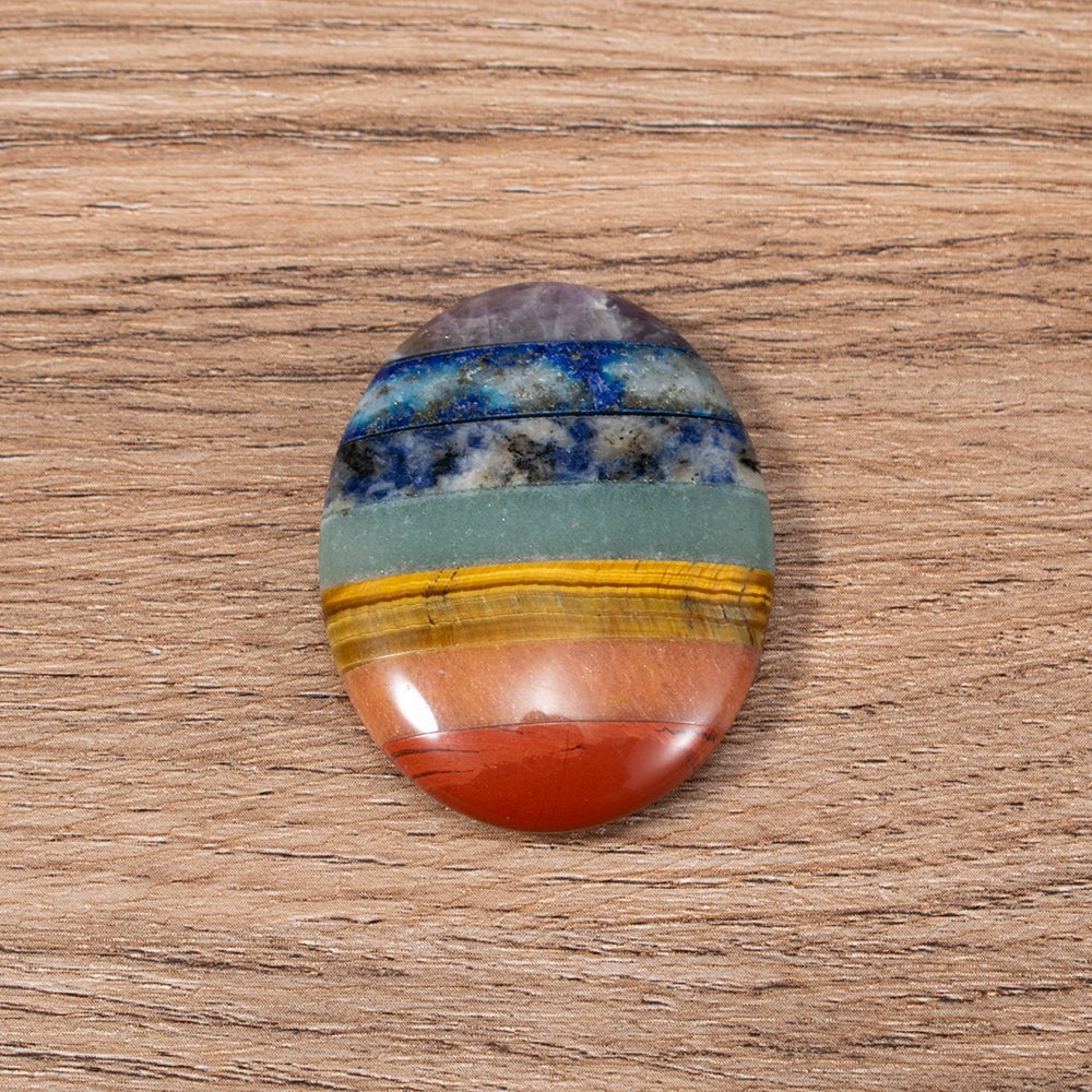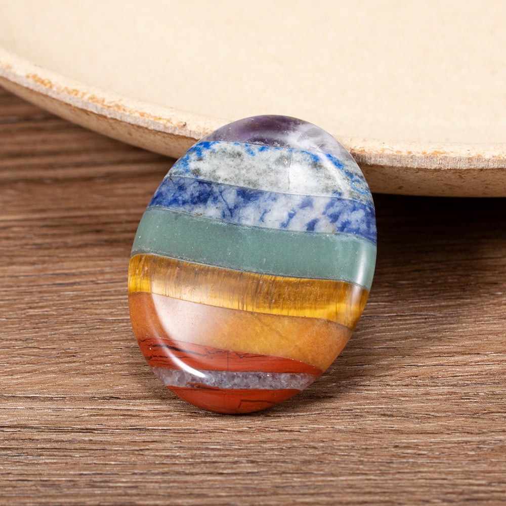 Each crystal in the Natural Seven Chakra Worry Stone is associated with one of the seven chakras: