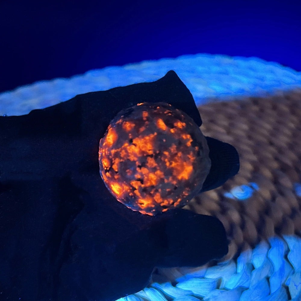 At first, it looks like any other rock. But when you shine a UV light on it, it glows with beautiful orange and yellow colors.