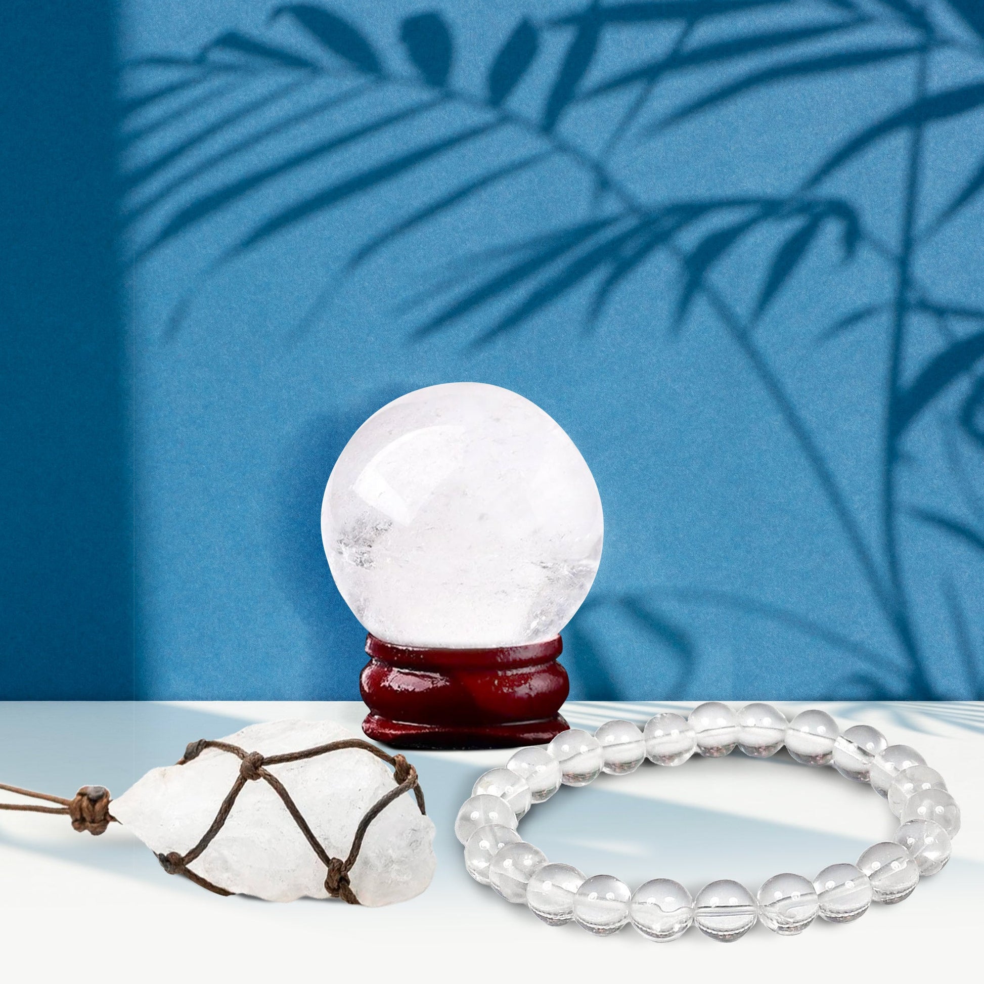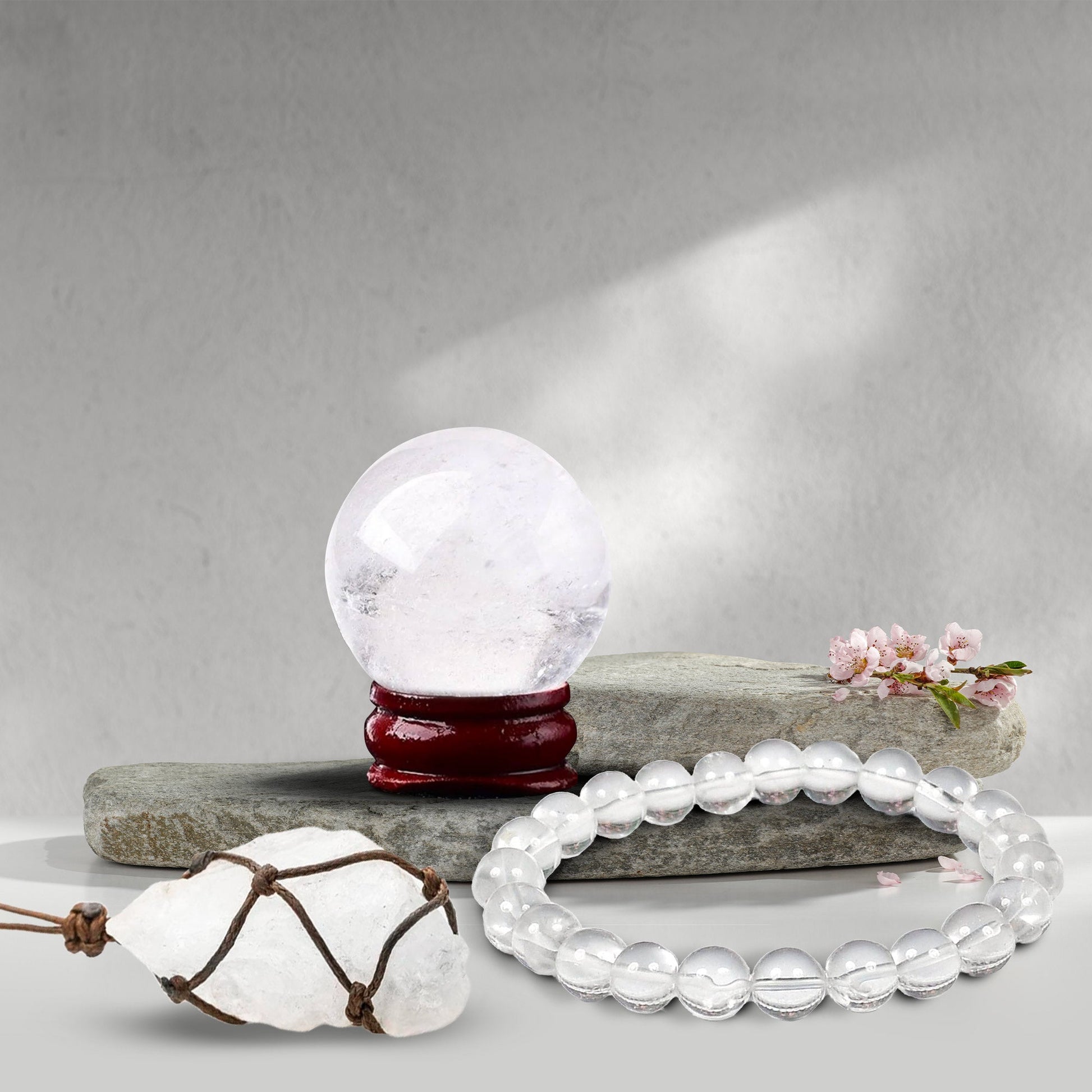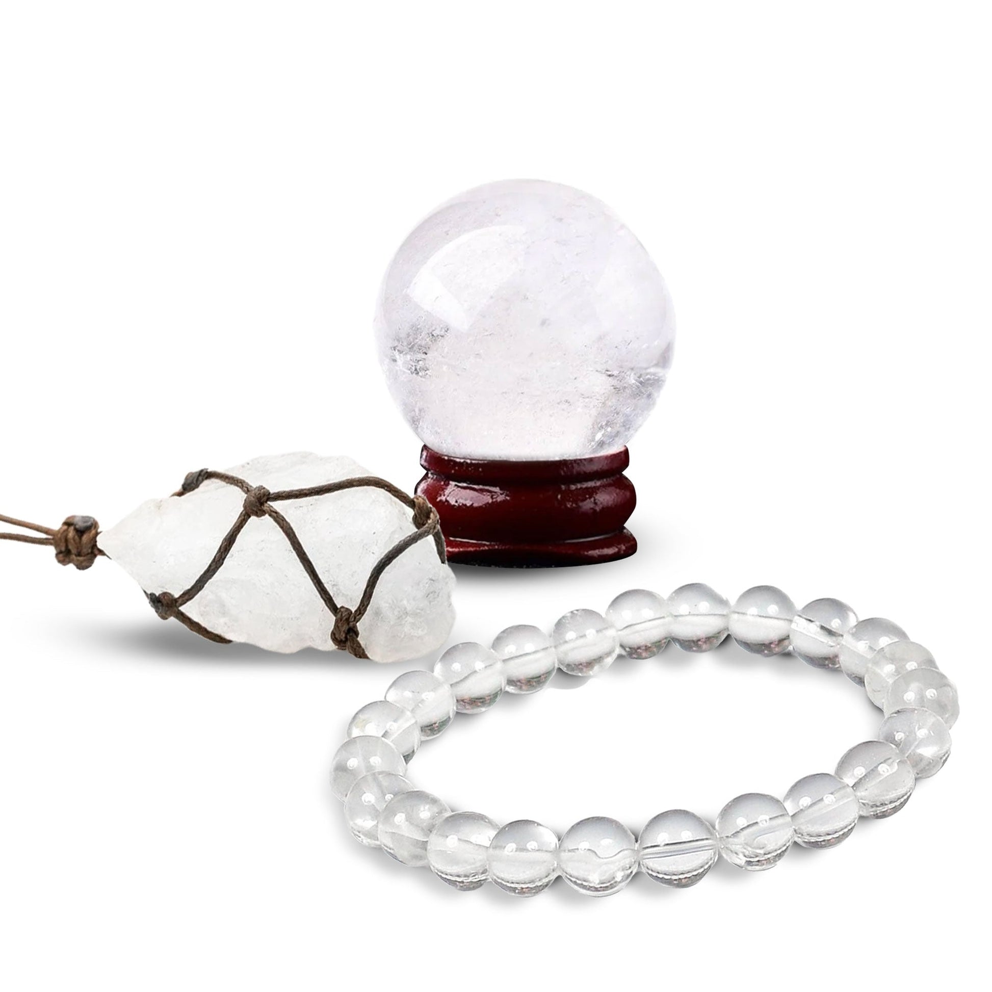 This exclusive bundle includes a Clear Quartz Bead Bracelet, a Wrapped Raw Clear Quartz Necklace, and a Polished Clear Quartz Crystal Ball, each piece meticulously crafted to harness the natural power of Quartz.