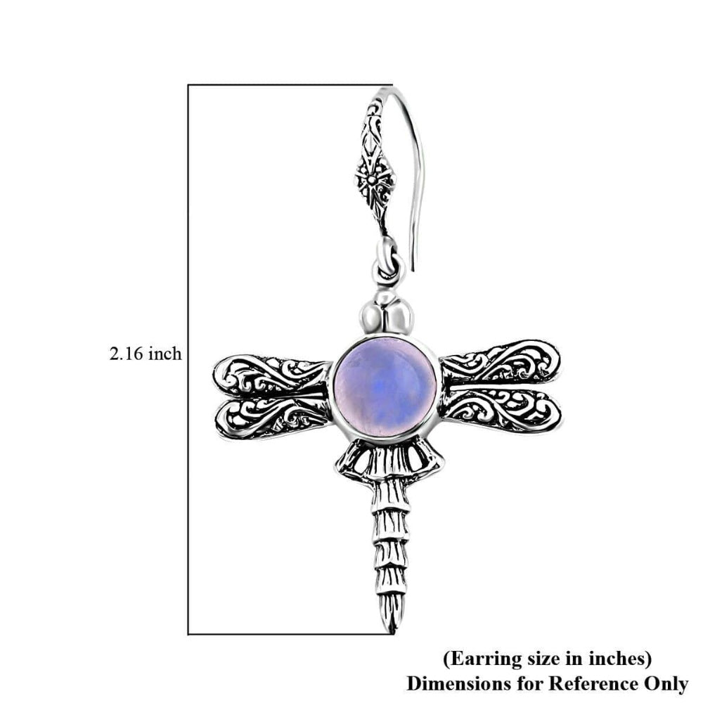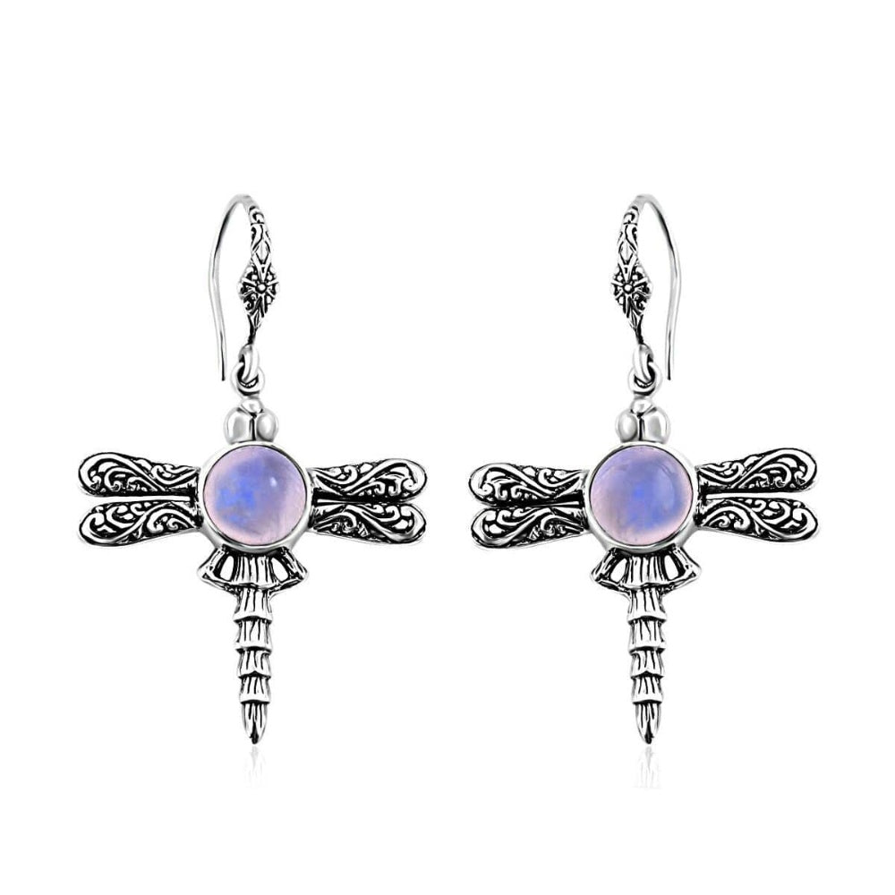 Explore the distinctive Balinese craftsmanship with these rainbow moonstone earrings. Each piece encapsulates handcrafted artistry. Every detail is etched manually by skilled artisans nestling each piece with the symbolism of a dragonfly in the design.
