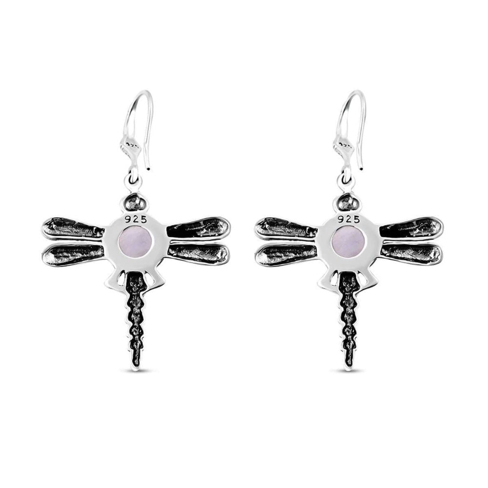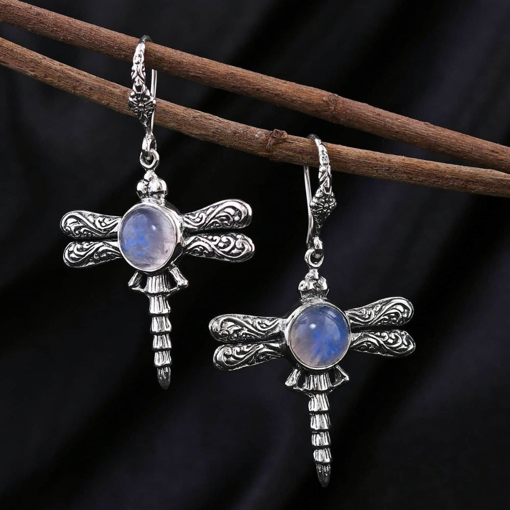 The earrings showcase rainbow moonstones. The unique adularescence of these mesmerizing gems is well known. Like the transformative symbolism of dragonflies, each moonstone's shifting hues magnify the magical appeal of these silver earrings.