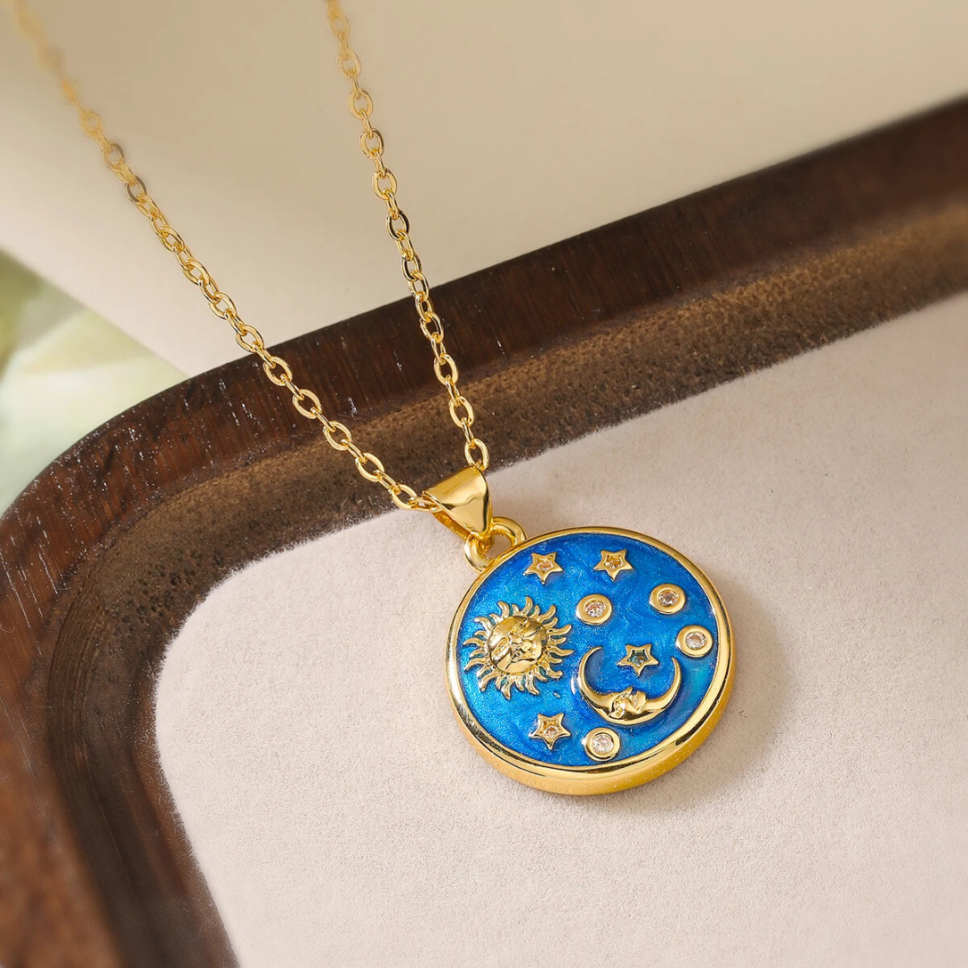 Fall in love with this gorgeous sapphire blue necklace. The deep blue color makes you feel calm and confident at the same time. With magical sun, moon, and star details, this special piece brings good vibes to your day. The bright blue pops against any outfit and makes you shine.