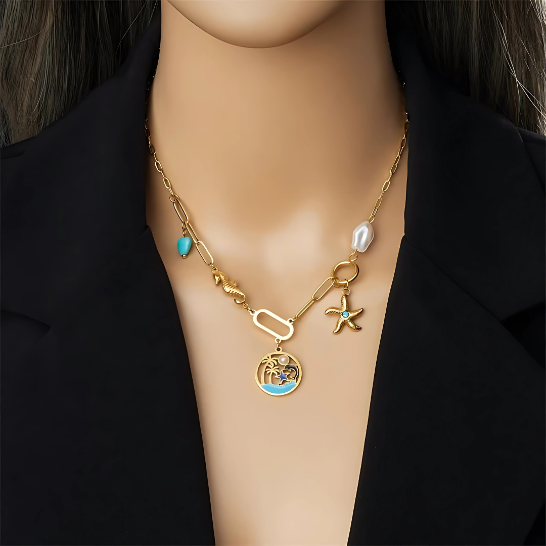 Let your wanderlust shine with this captivating ocean-inspired masterpiece. The artfully arranged charms—including a sculptural starfish and scenic beach pendant—dance along a luxurious gold chain, while stunning baroque pearls add timeless sophistication. An asymmetric design that celebrates your free-spirited nature.
