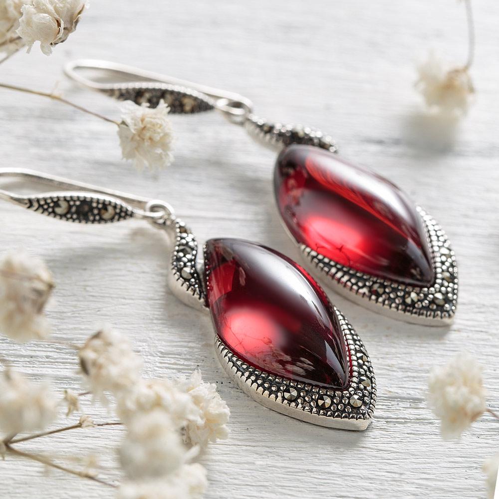 Red Garnet stone earrings act as an energizer. According to color theory, red color radiates soothing warmth enhancing confidence, charisma, and sexual energy.