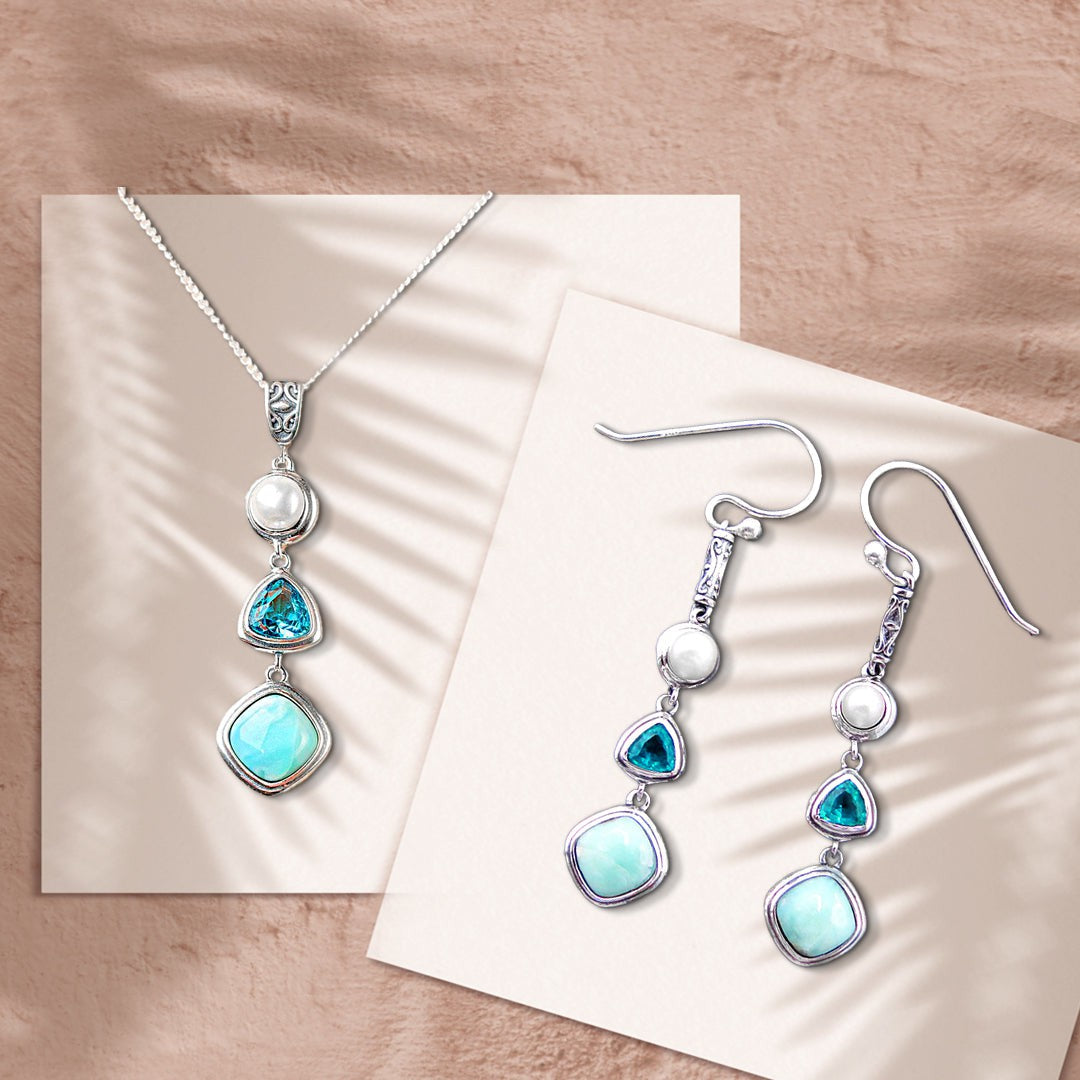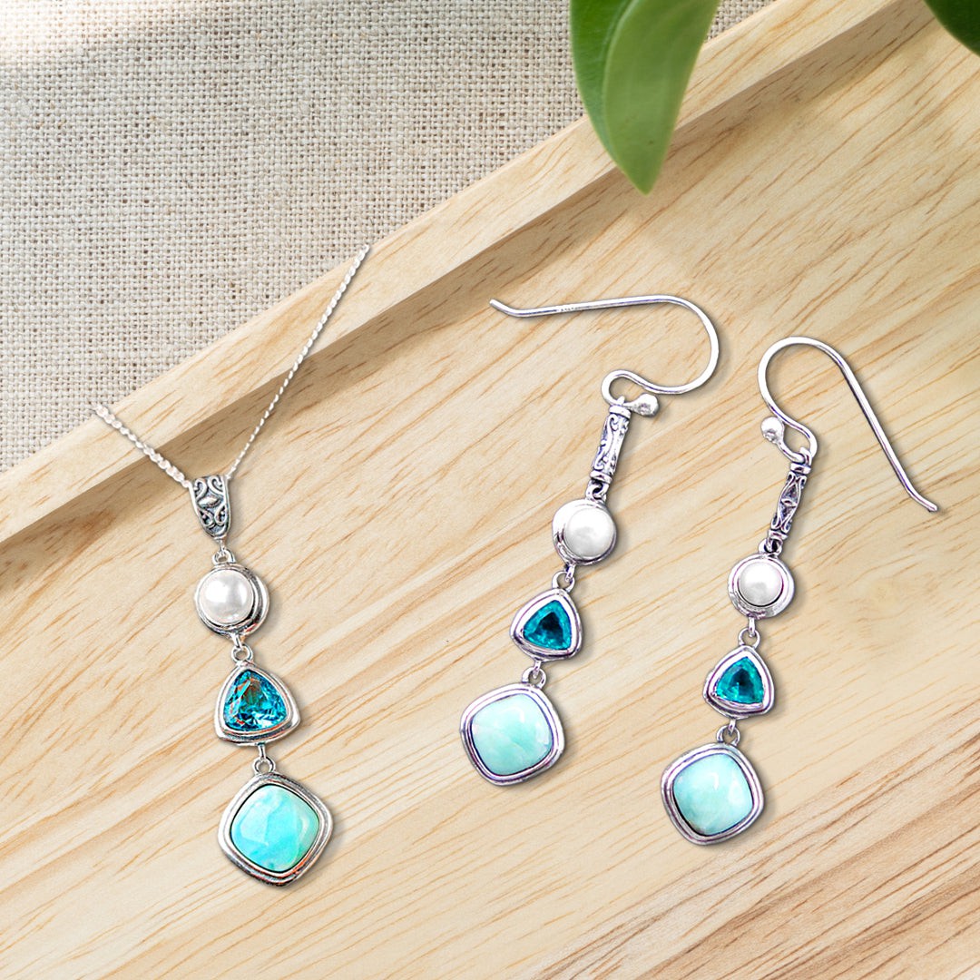 The Silver Larimar Set, including a Larimar Necklace and a pair of Larimar Earrings, is the perfect addition to your jewelry collection.