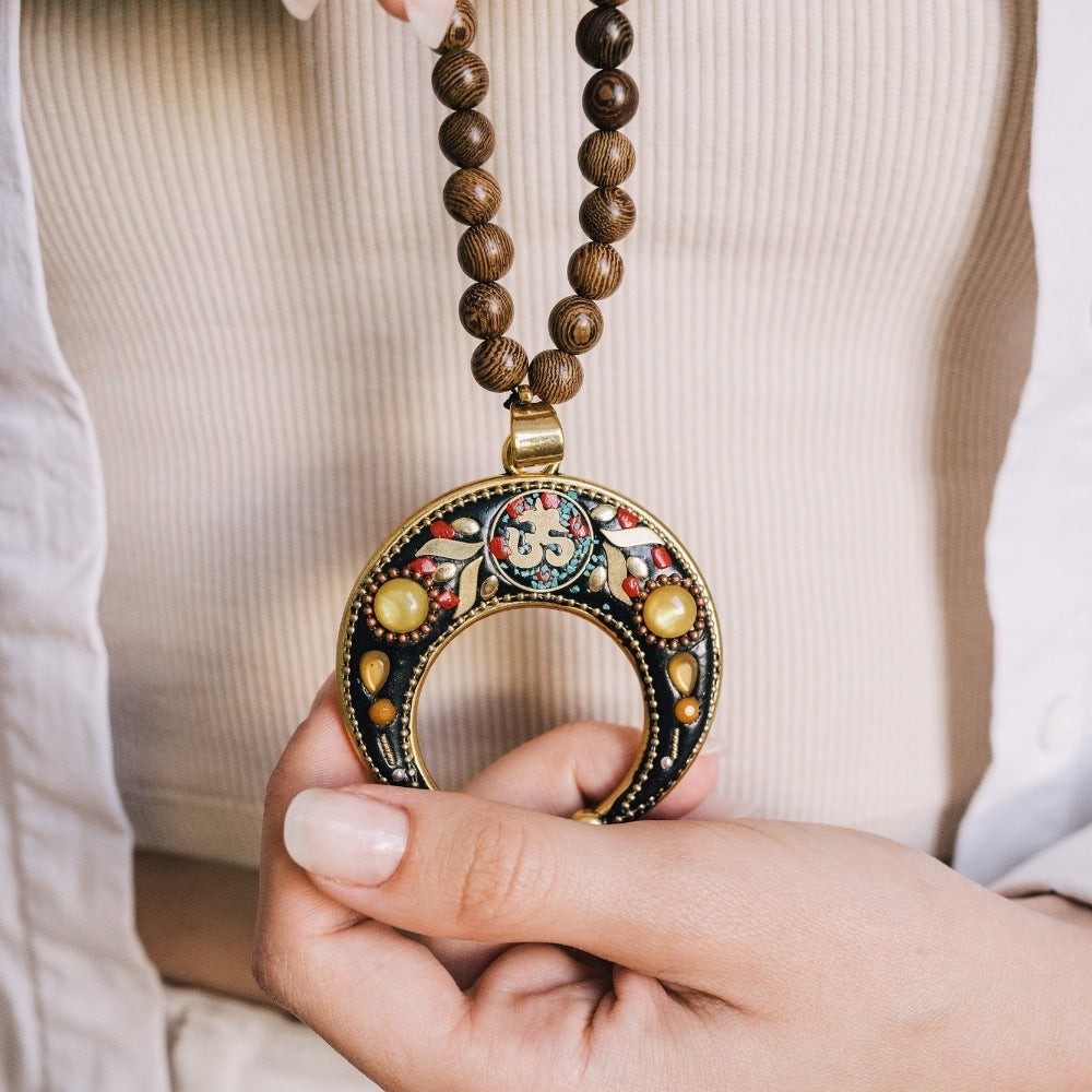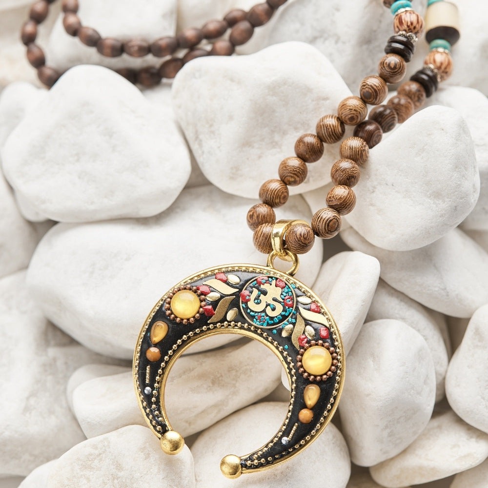 Let the crescent moon rise from within you and give you a more profound spirituality. Below the lovely wooden beads, the suspended crescent moon holds one of the most sacred and powerful symbols - the OM.