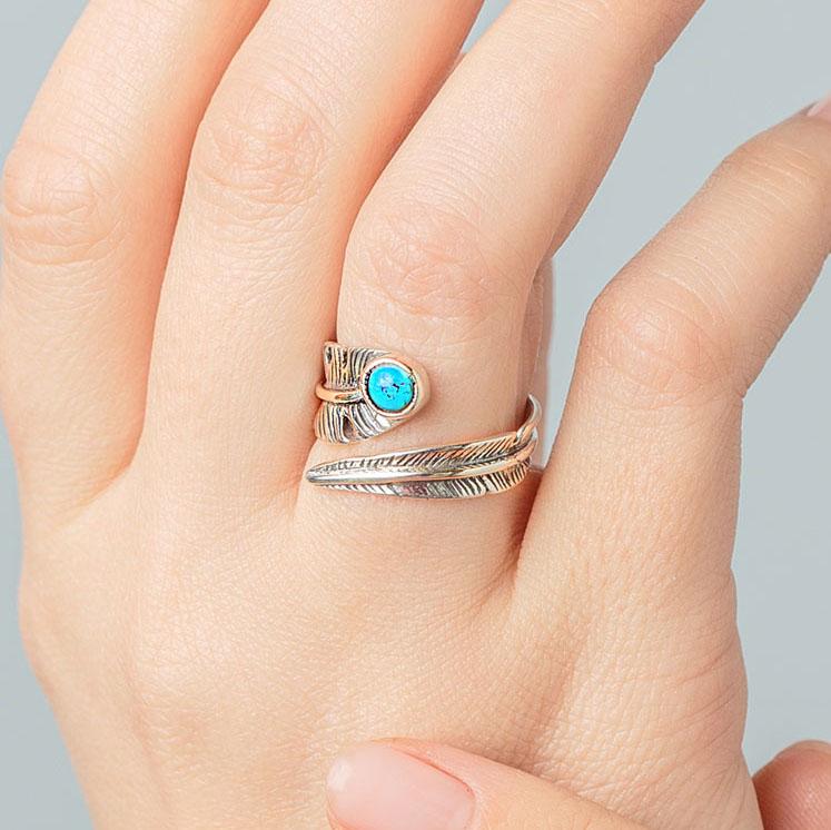 Sculpted with delicate details to mimic the look of a natural feather, this wrap-around sterling silver Freedom Feather Turquoise Ring features a real turquoise stone, which adds its own properties.