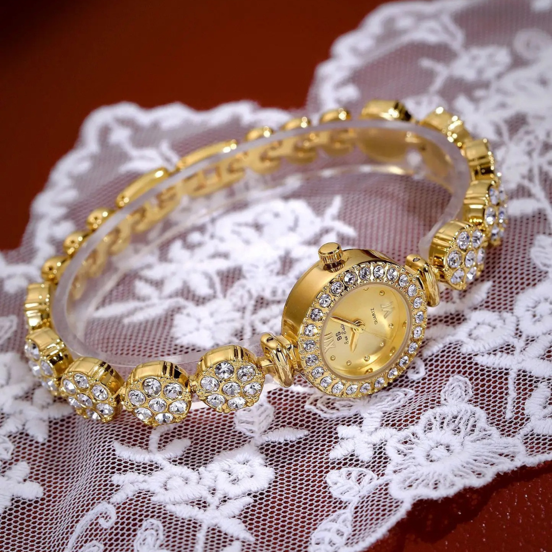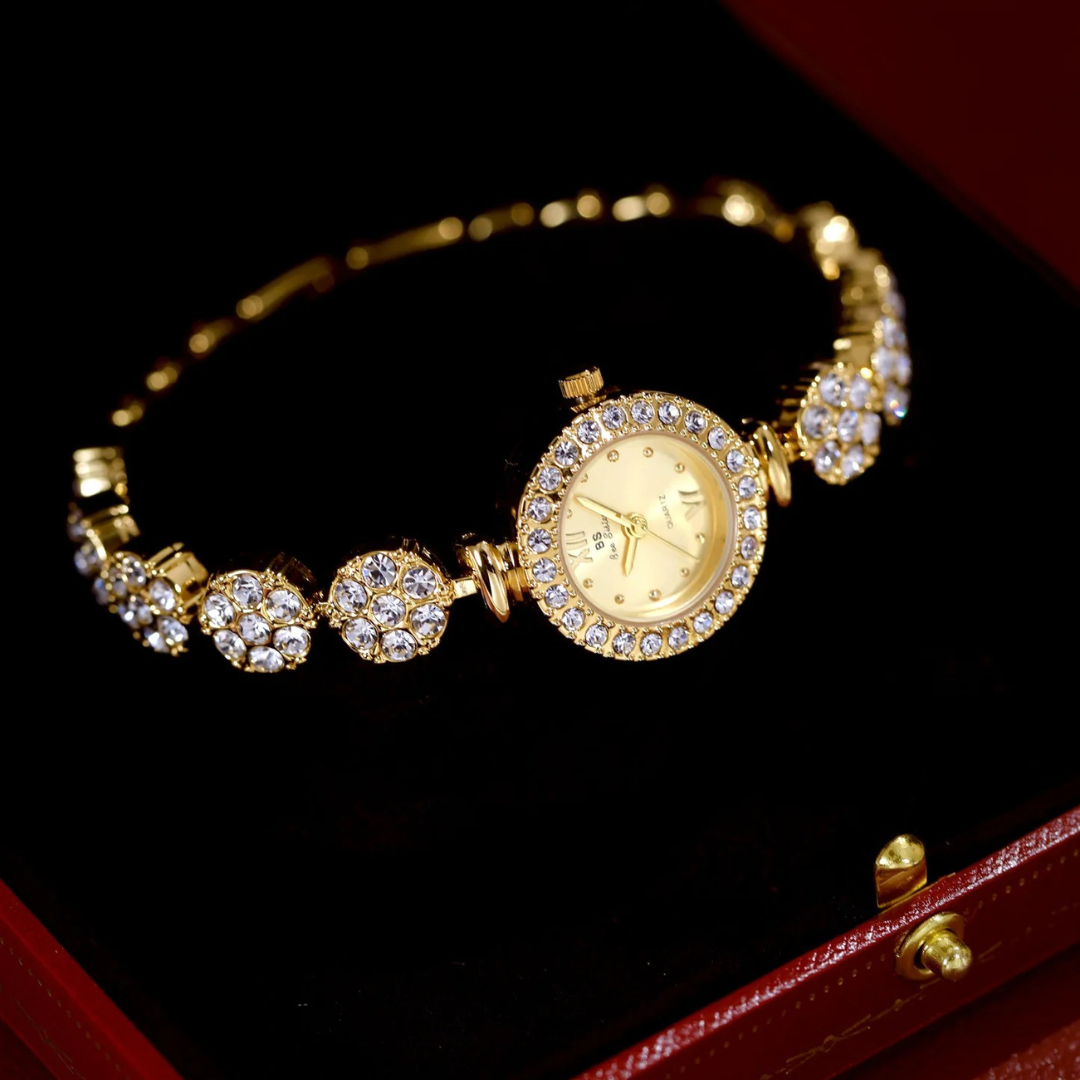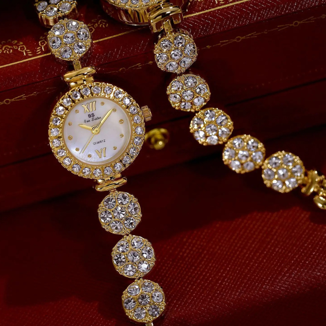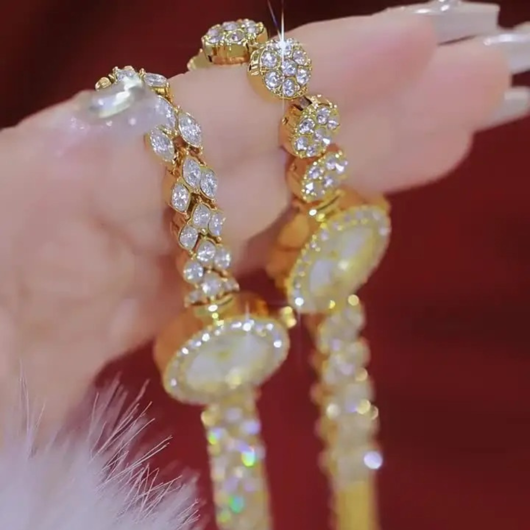 This stunning timepiece features a sparkling crystal-encrusted bracelet with luxurious pavé-set stones that catch every ray of light. The glamorous round face is beautifully framed by glittering crystals, while classic Roman numerals add sophisticated charm. Perfect for elevating any outfit with radiant, eye-catching sparkle.