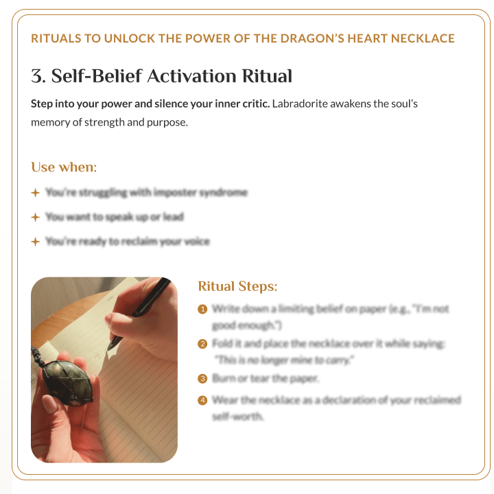 With this guide, you’ll receive easy-to-follow rituals that incorporate your Dragon's Heart necklace into your daily life, including: